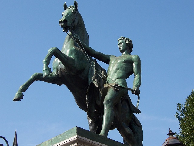 Statue on the left.