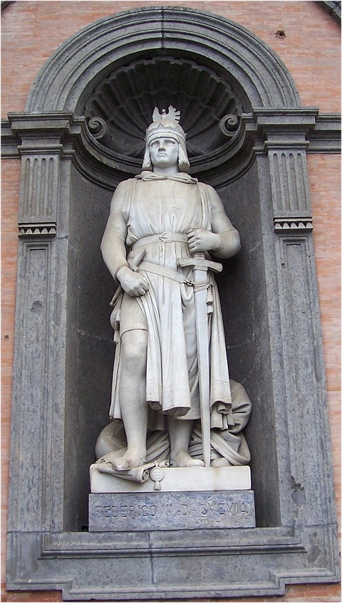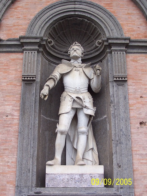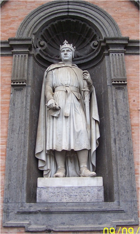 Holy Roman Emperor Fredrick II - Federico di Svevia From the house of Hohenstaufen, Fredrick was king of Germany, Holy Roman Emperor, King of Jerusalem and founder of the University of Naples in 1224 as the first state university in the West. In his time, he was called Stupor Mundi or the "Wonder of the World." He was highly educated and interested in many things. He inherited the Kingdoms of (Northern) Italy, Germany and the Norman kingdom (including Naples and Sicily) from his grandfather Frederick Barbarossa. Although from German royal stock, he was born in Italy in Le Marche at Jesi. He spoke Italian and other Italic languages better than German and is buried in Palermo, Sicily. His castle in Puglia is featured on the one cent Euro. His influence is still felt throughout Southern Italy as the builder of cultural and intellectual institutions. Charles d'Anjou - Carlo d'Angiό "Angió" is "Anjou" to Anglophones. Charles d'Anjou was one of Naples' French Kings. There is a distinct French influence to be heard in the language of Naples and also felt in the Bourbon Royal Patronage of the city. However, in general, the French kings were not as well liked as the Spanish. Pope Urban IV bestowed the Kingdom of the Two Sicilies upon Charles in 1263. More substantive bio of Charles d'Anjou later.